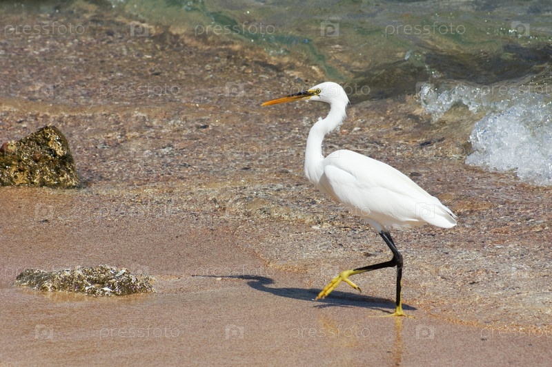 Белая цапля, прогуливающаяся по пляжу