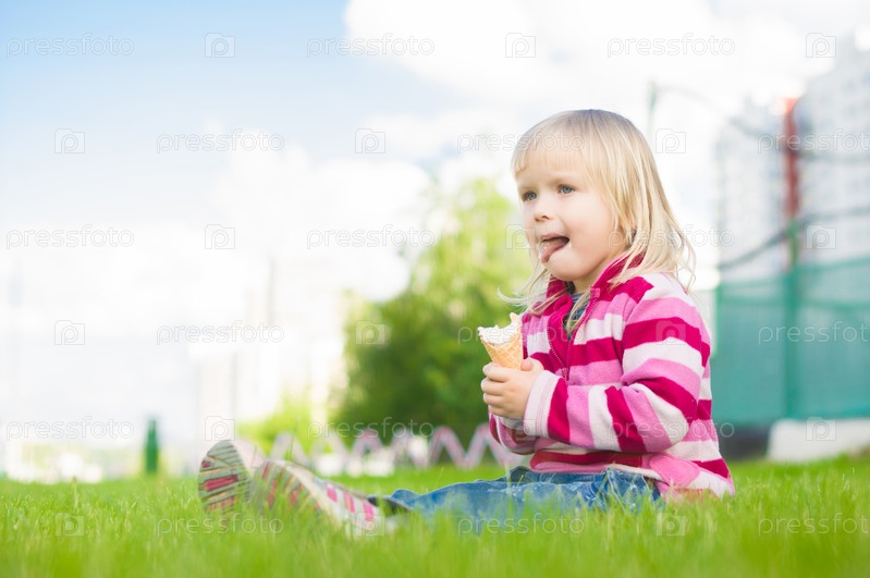 Девочка ест мороженое на зеленой траве