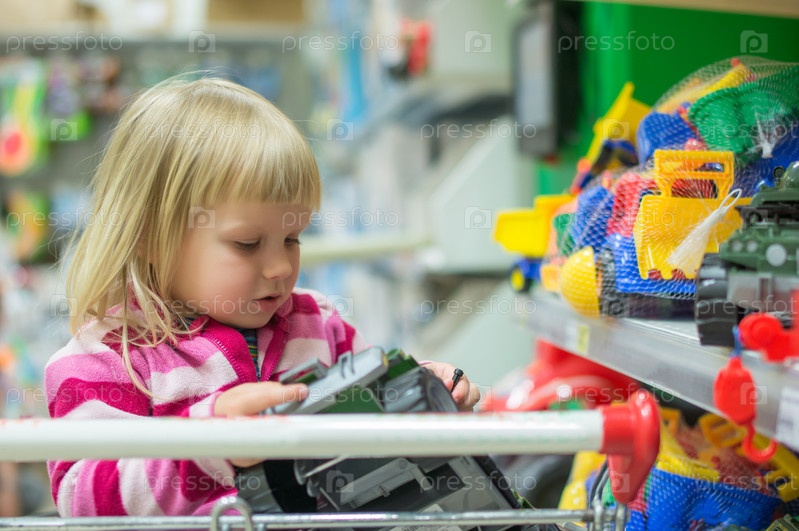 Девочка выбирает игрушки в супермаркете