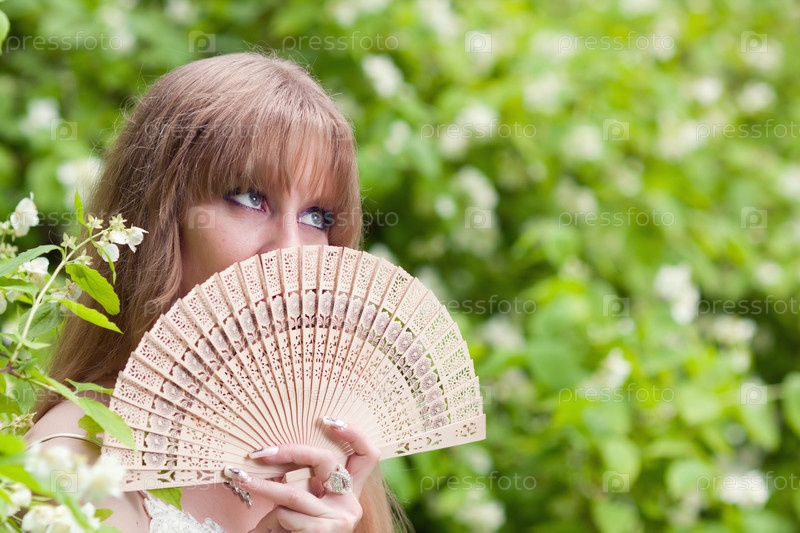 Красивая девушка с веером в зарослях