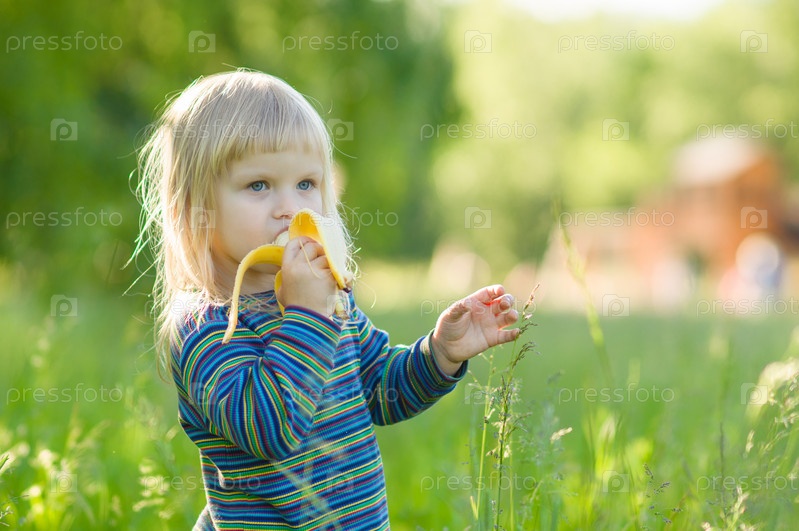Девочка ест банан в парке