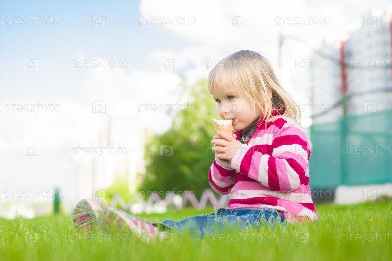 Очаровательная девочка ест мороженое, сидя на траве