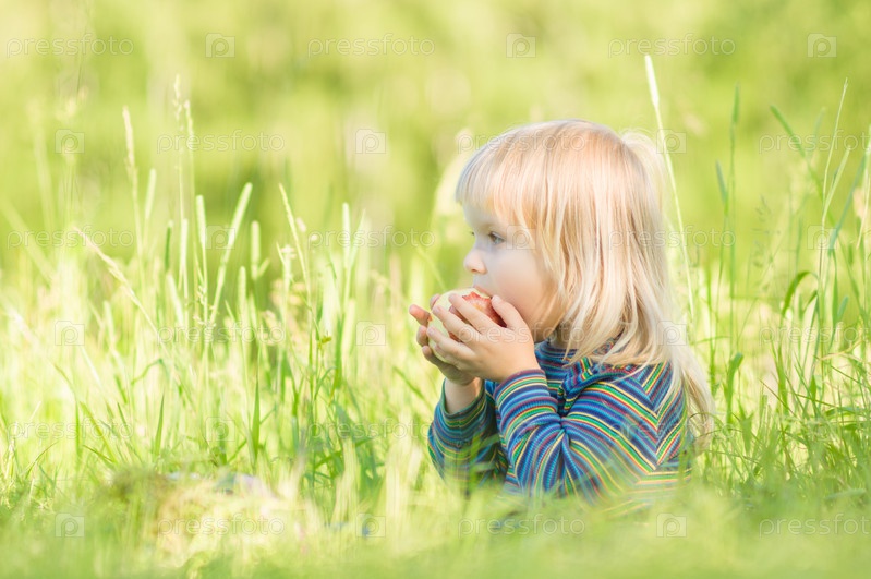 Очаровательная девочка ест красное яблоко, сидя на траве в парке