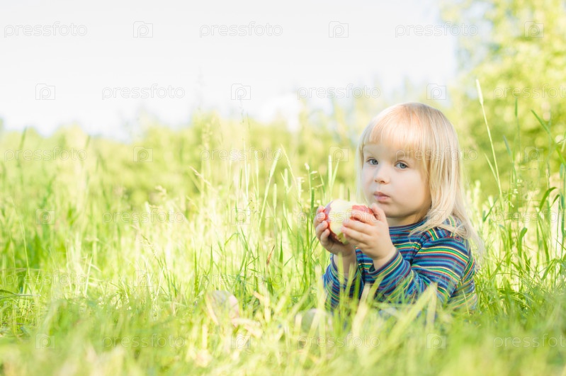 Очаровательная девочка ест красное яблоко, сидя на траве в парке