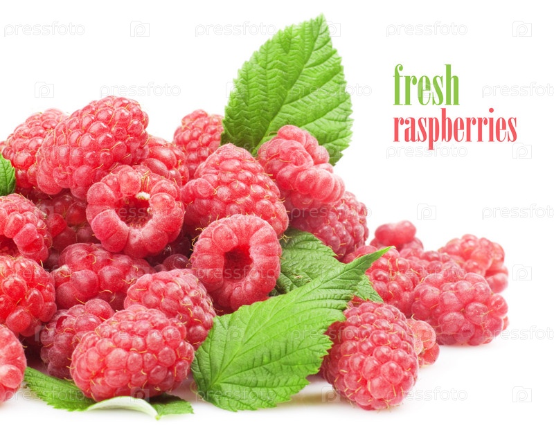 Свежая малина с зелеными листьями на белом фоне