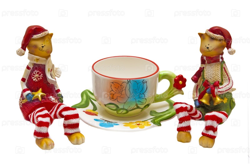 Забавные статуэтки в виде кошек и чашка с блюдцем