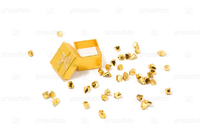 Пустая открытая золотая шкатулке и золотые элементы на белом фоне