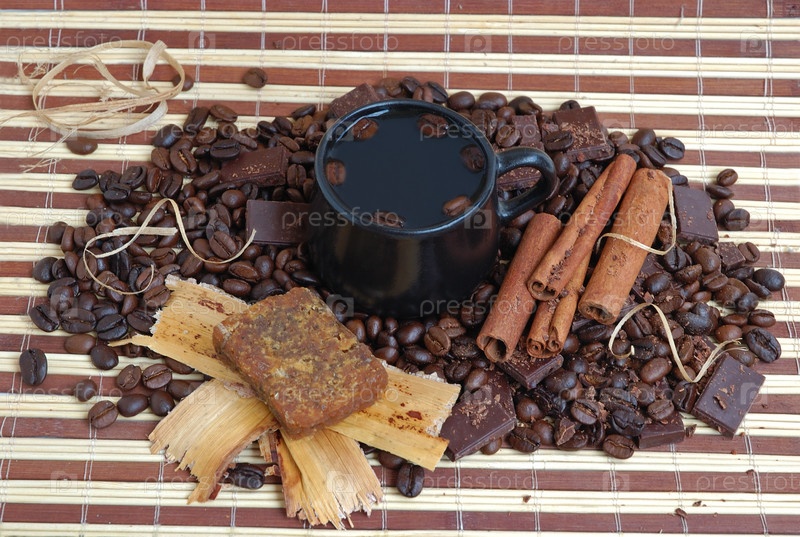 Чашка кофе с корицей, конфетами и шоколадом на бамбуковом коврике