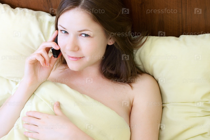 Молодая симпатичная женщина с мобильным телефоном в постели