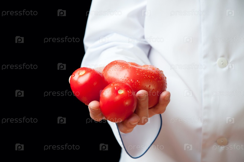 Шеф-повар держит свежие помидоры, черный фон