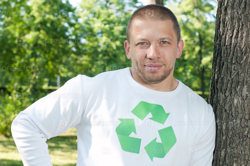 Взрослый мужчина с символом рециркуляции на одежде в парке