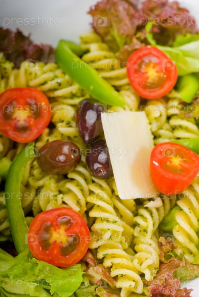 Салат из фузилли с пармезаном, помидорами, маслинами и овощами, заправленный оливковым маслом и соусом песто