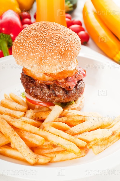 Классический американский гамбургер с луком и картофелем фри