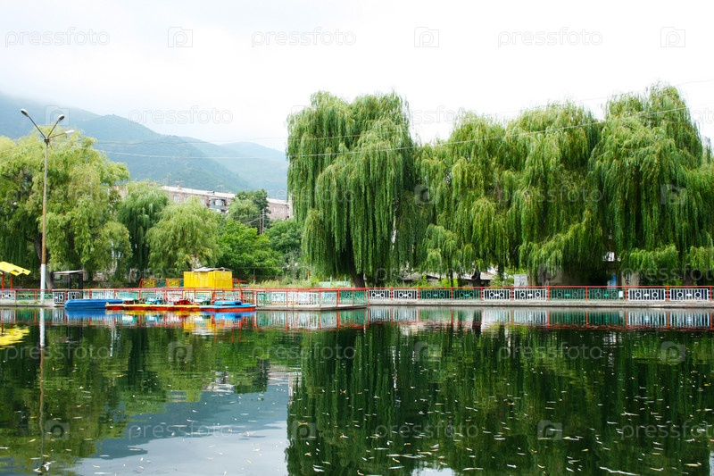 Ивовые деревья на берегу озера в городе Ванадзор, Армения