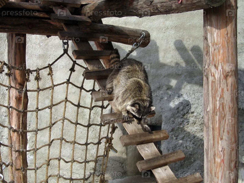 Енот движется вниз по лестнице