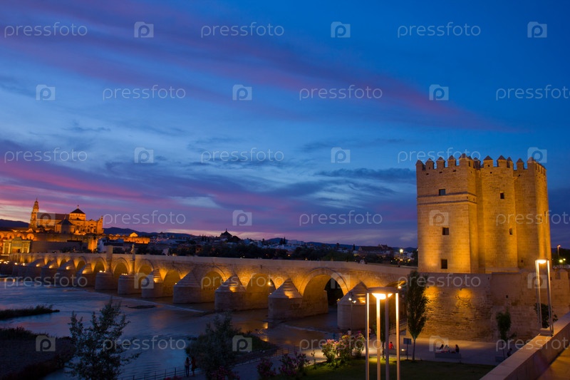 Старый римский мост и башня Калахора ночью, Кордова, Испания