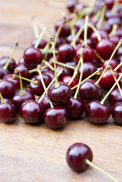 Спелые ягоды вишни на старом деревянном столе