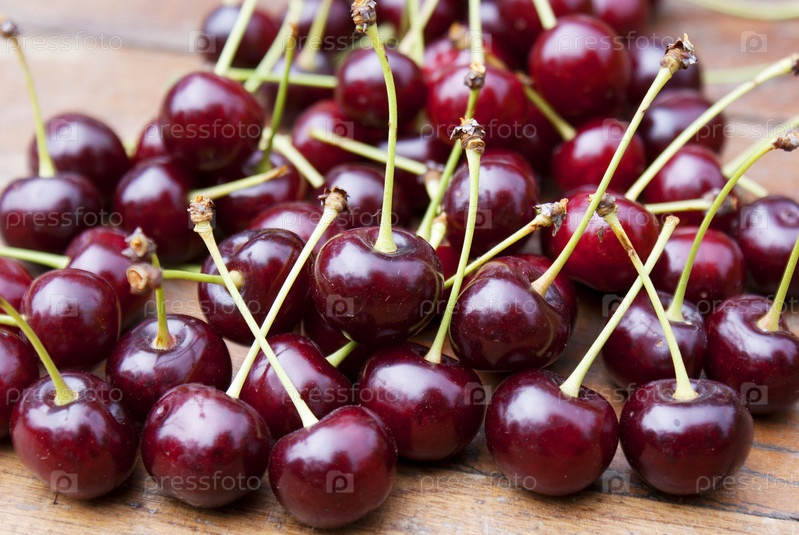 Спелые свежие ягоды вишни на старом деревянном столе