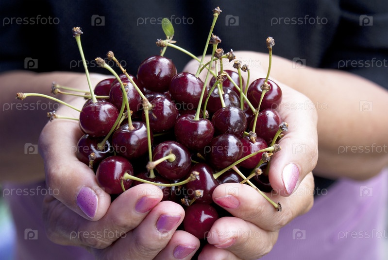 Спелые темно-бордовые вишни в женских руках
