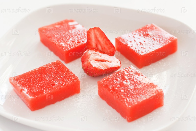Кусочки клубничного желе с клубникой на белом фоне