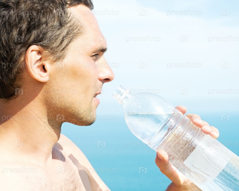Молодой человек с пластиковой бутылкой воды на фоне неба
