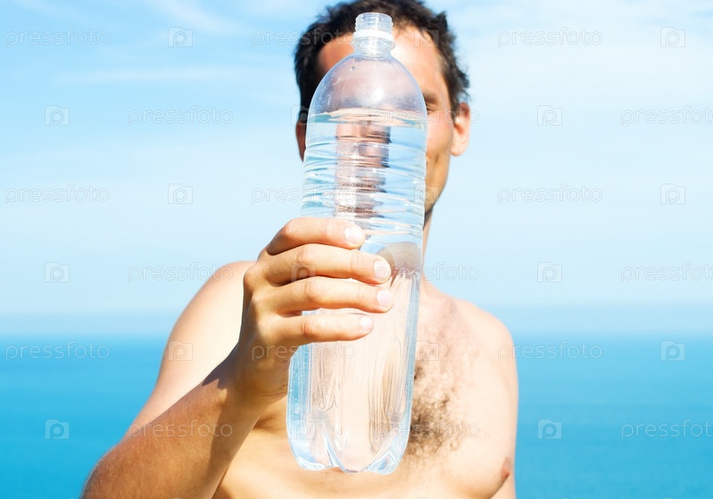 Молодой человек с пластиковой бутылкой воды на фоне неба