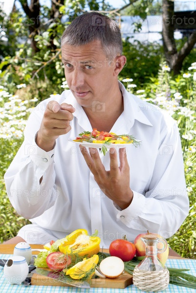 Мужчина-вегетарианец дегустирует салат из свежих аппетитных овощей