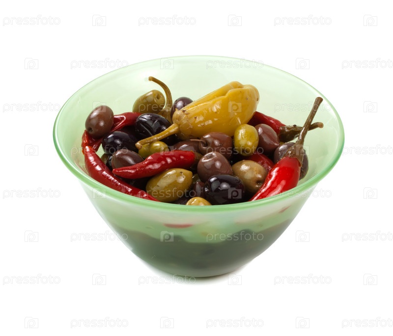 Чаша с оливками и острым перцем на белом фоне
