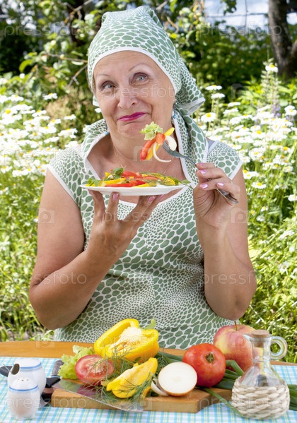 Женщина кушает салат из свежих овощей в летнем саду
