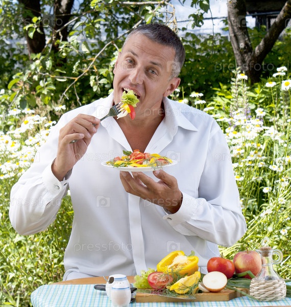 Мужчина-вегетарианец кушает салат из свежих аппетитных овощей