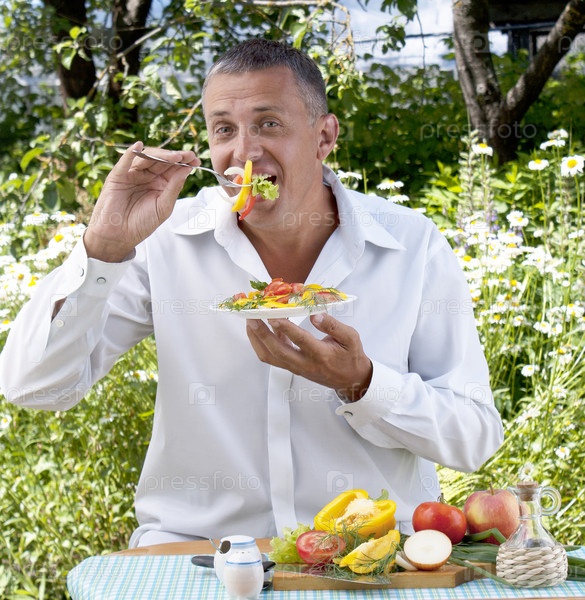Мужчина-вегетарианец кушает салат из свежих аппетитных овощей