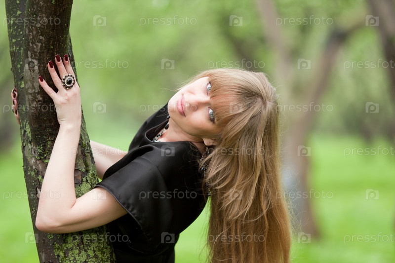 Девушка прислонилась к дереву