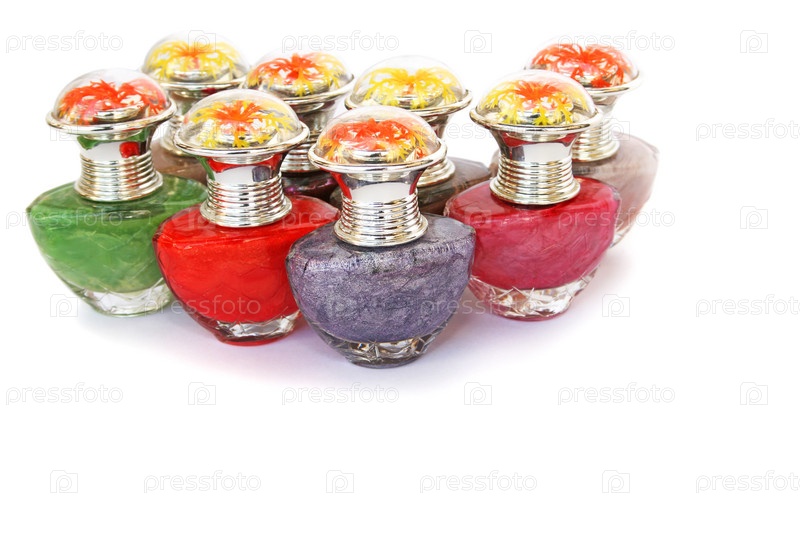 Разноцветный лак для ногтей на белом фоне