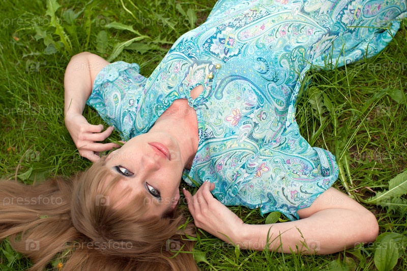 Девушка в бирюзовом платье на траве