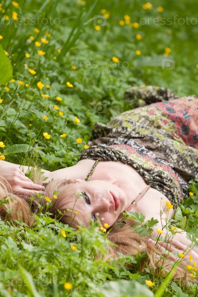 Женщина лежит на траве среди мелких желтых цветов