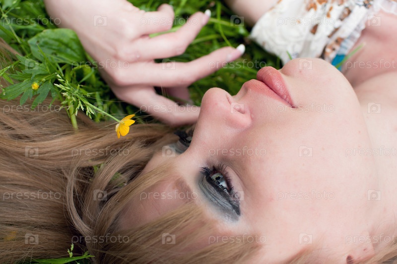 Лицо женщины в траве среди мелких желтых цветов