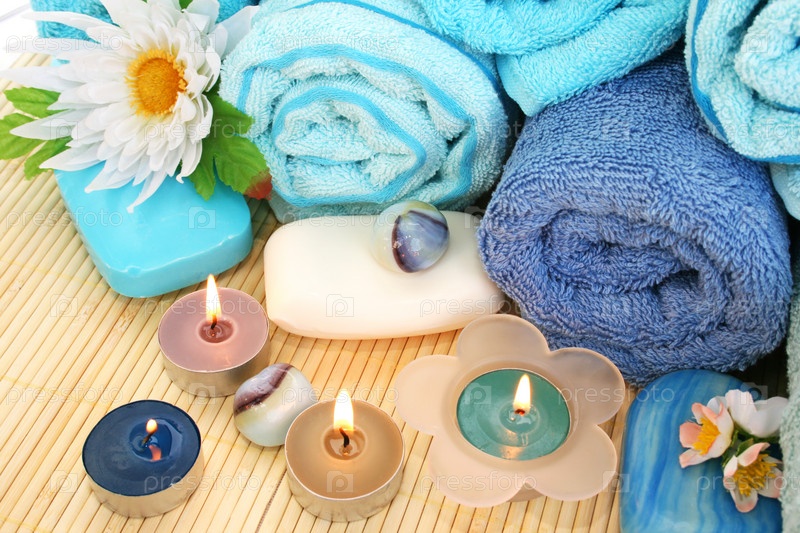 Полотенца, мыло, свечи, камни и цветы на фоне коврика