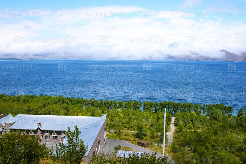 Озеро Севан и горы в облаках в Армении