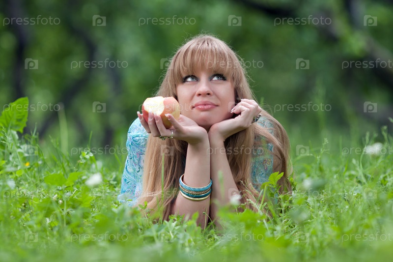 Девушка лежит в траве и ест яблоко