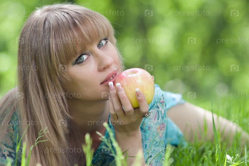 Девушка лежит в траве и ест яблоко
