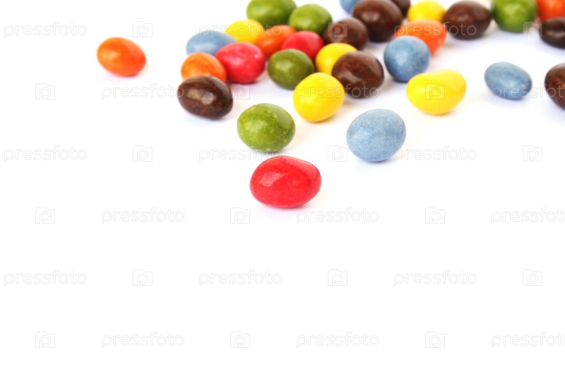Разноцветные конфеты с изюмом и арахисом, изолировано на белом фоне