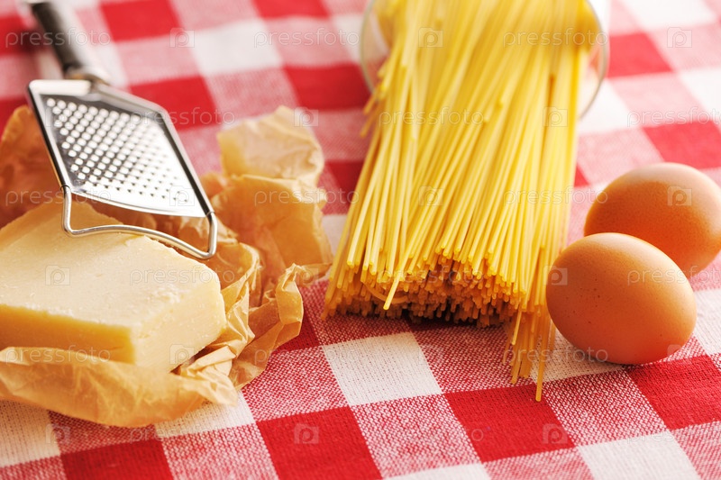 Паста и другие ингредиенты на красной скатерти