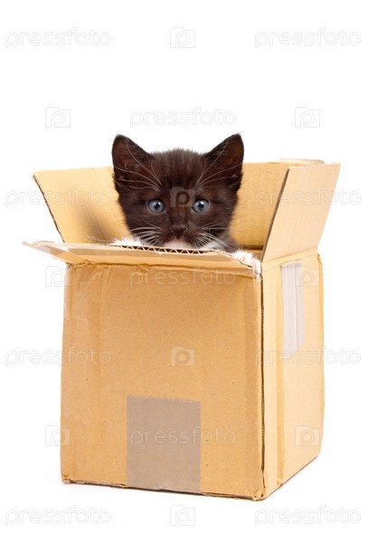 Черный котенок в коробке на белом фоне