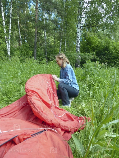Женщина ставит палатку