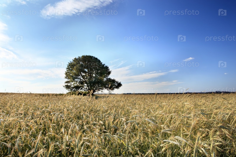 Одинокое дерево в пшеничном поле и голубое небо с облаками. Пейзаж