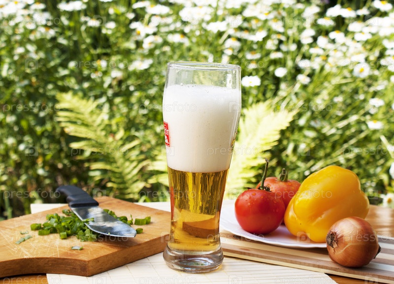Свежее ячменное пиво с овощами в летнем саду