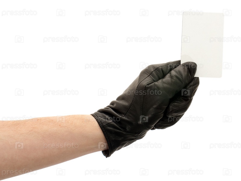Рука в черной кожаной перчатке держит пустую кредитную карту, изолированная на белом фоне
