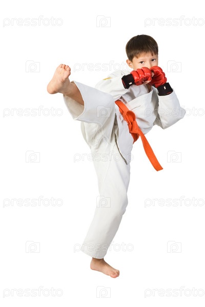 Мальчик в белом кимоно занимается айкидо
