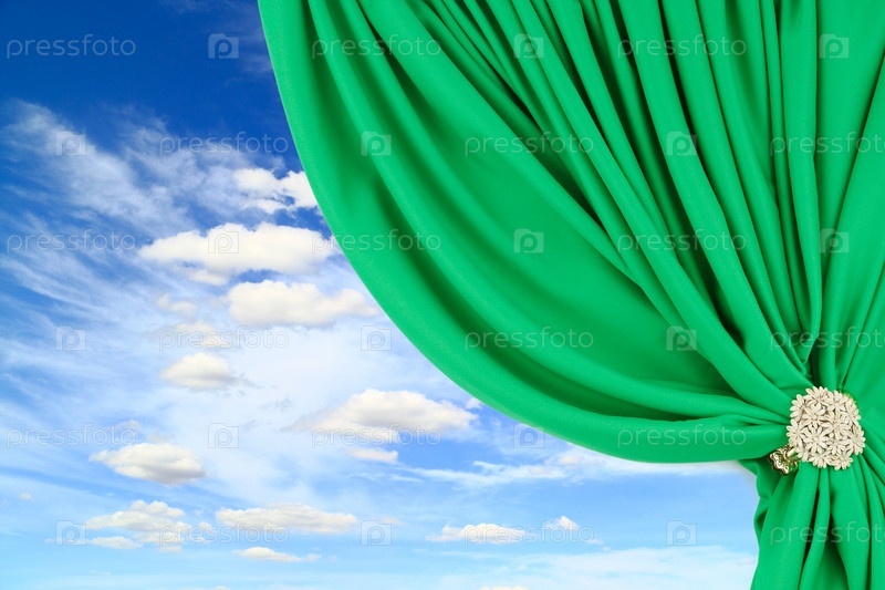 Красивое голубое небо и задрапированная зеленая штора