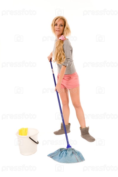 Молодая женщина моет пол